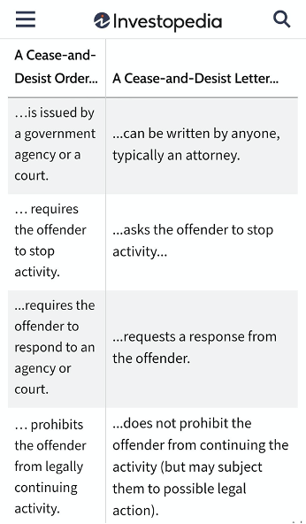 Cease and desist can take one of two forms: an order (injunction) issued by a government administrative agency or the courts to stop suspicious or illegal activities, or a letter, typically written by an attorney, often a first formal step taken to ask a party to stop performing an illegal activity. A cease-and-desist order has legal power. A cease-and-desist letter is not legally binding, although a follow-up lawsuit could be. -Investopedia